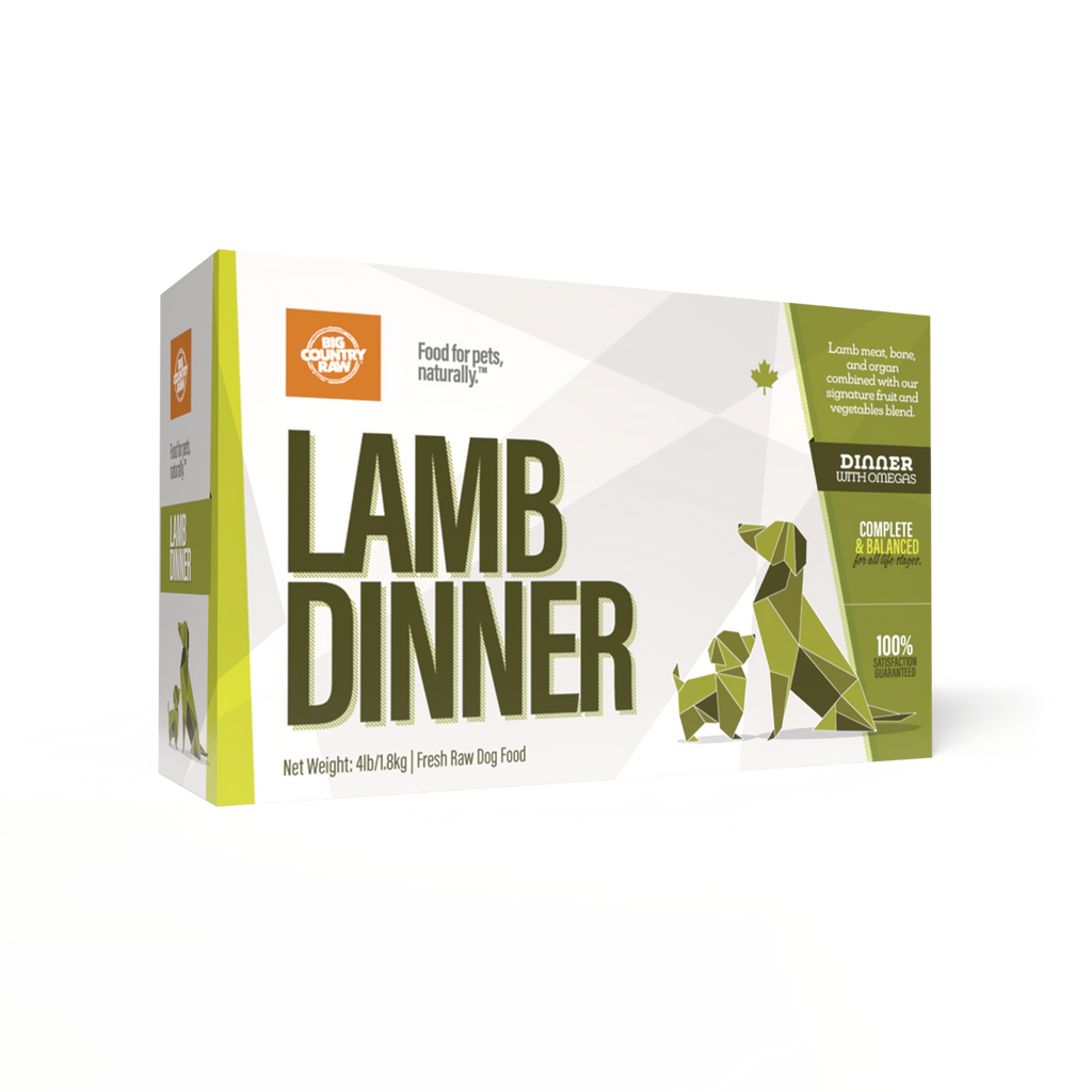 INGREDIENTS: Lamb, lamb bone, lamb liver, cranberries, lamb spleen, spinach, broccoli, zucchini, lamb kidney, monocalcium phosphate, blueberries, calcium carbonate, cod liver oil, kelp, barley grass, wheat grass, salt, docosahexaenoic acid (DHA), zinc proteinate, manganese proteinate, copper proteinate, vitamin E (a-tocopherol acetate).