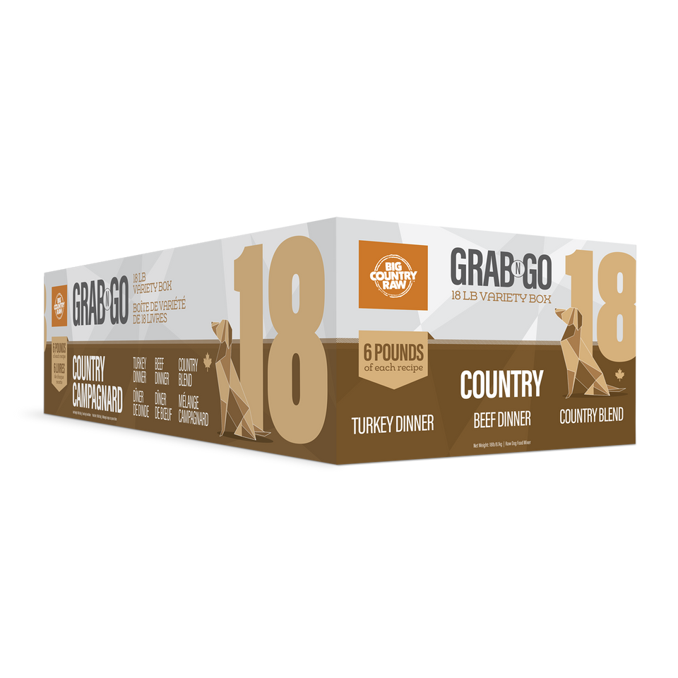 Contains 6lbs each: Turkey Dinner, Beef Dinner, Country Blend